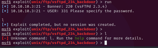 Este FTP es conocido por tener una backdoor que se activa si se conecta con un nombre de usuario que incluya :), pero al intentar explotarlo con Metasploit, no conseguimos acceso. El exploit requiere autenticación o conexión directa a un backdoor que, en esta máquina, parece estar desactivado o parchado.