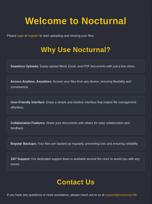 Haciendo whatweb confirmamos que la web usa PHP y que hay un contacto support@nocturnal.htb: