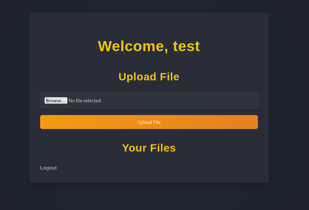 Al abrir la web vemos registro/login y la capacidad de subir archivos (upload). Subimos un test.pdf de prueba para observar comportamiento.