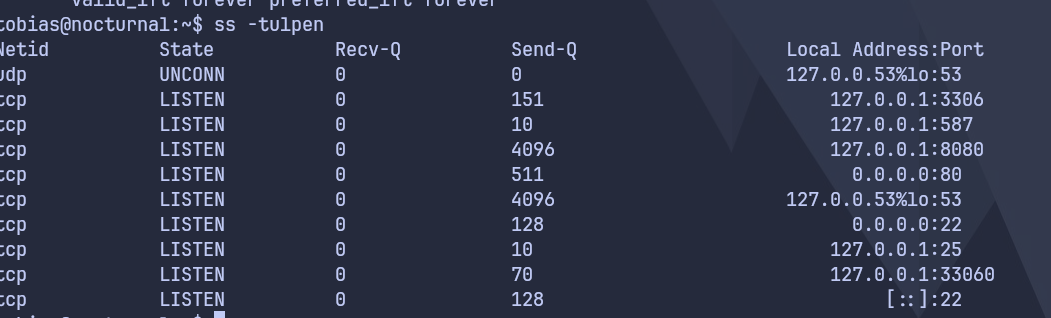 Desde la cuenta tobias buscamos servicios escuchando sólo en 127.0.0.1 (puertos locales). ss -ltnp/netstat muestra un servicio escuchando en 127.0.0.1:8080 (no expuesto públicamente).