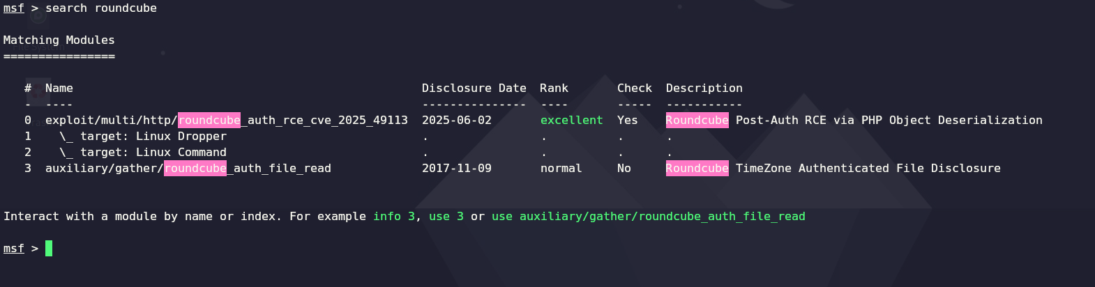 msf6 > use exploit/multi/http/roundcube_auth_rce_cve_2025_49113